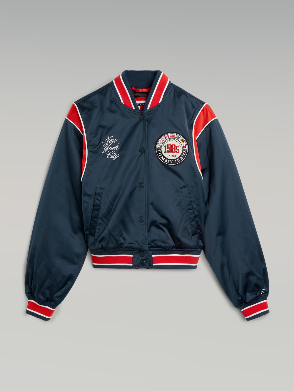 Shimmering in nylon satin, this archival team jacket reworks classic varsity codes with a 2024 perspective.