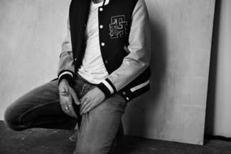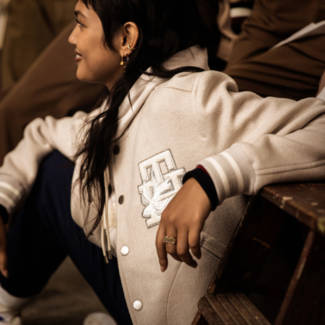 The varsity jacket - with 70% recycled wool blend, and sleeves made from 30% ECONYL® recycled nylon.